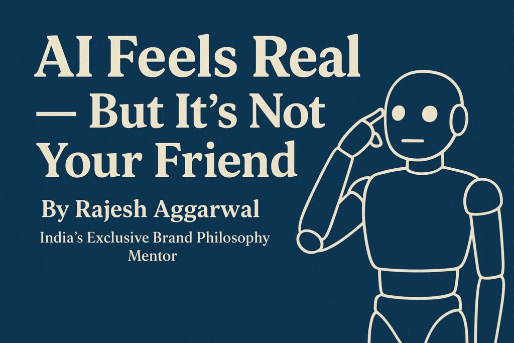 Our Blogs 🧠 𝐀𝐈 𝐅𝐞𝐞𝐥𝐬 𝐑𝐞𝐚𝐥 — 𝐁𝐮𝐭 𝐈𝐭’𝐬 𝐍𝐨𝐭 𝐘𝐨𝐮𝐫 𝐅𝐫𝐢𝐞𝐧𝐝 By Rajesh Aggarwal | India’s Exclusive Brand Philosophy Mentor ⸻ In this new age of artificial intelligence, we’ve built machines that can code, create, and even… comfort. ChatGPT, Gemini, Claude — they don’t just answer questions anymore.They respond with empathy.With warmth.With uncanny emotional intelligence. And therein lies …